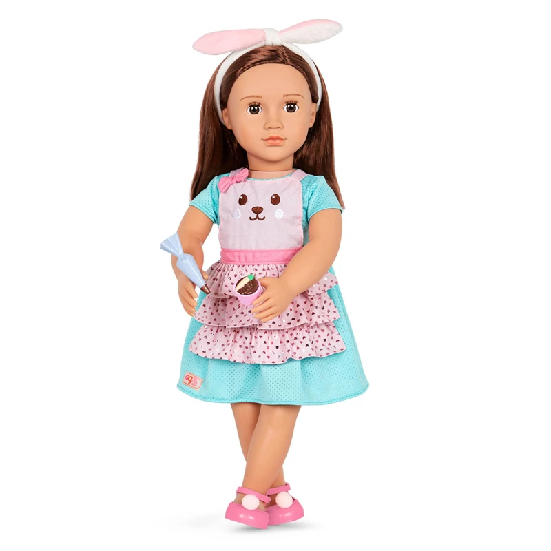 Contient : Robe, Tablier, Bandeau, Carrot Cupcakes, Chaussures avec pompon, Panier à Cupcakes, Bouteille de chocolat.