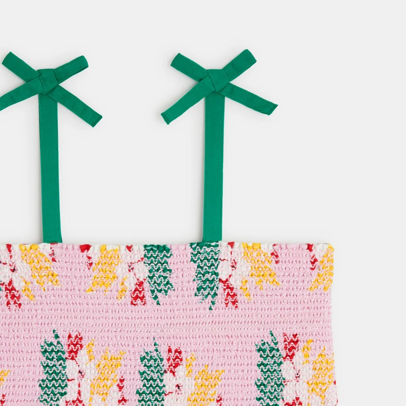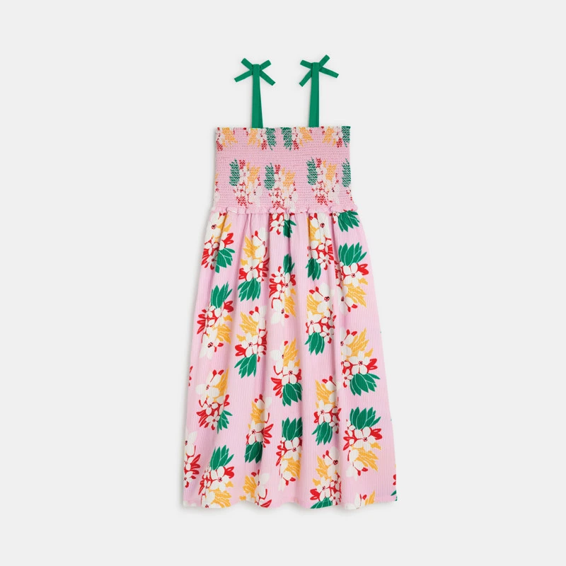 Robe à bretelles pour fille à motifs fleuris roses, ivoire, vert lichen et jaune bouton d’or. Coupe droite à smocks au buste, puis évasée à la taille, col droit et bretelles. En coton seersucker. Buste extensible. Signature Catimini sur le côté.