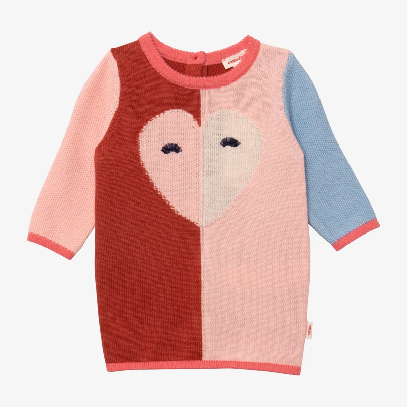 Robe rose églantine pour bébé fille. Coupe droite, avec col rond et manches longues. Tricot Intersia de coton, viscose et polyamide mélangés, avec motif cœur et broderie. Mini bords-côtes au col, manches et bas de robe. Fermeture par boutons dos. Signature Catimini côté.