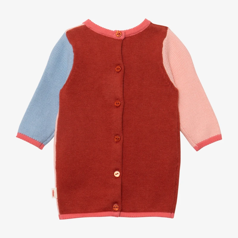Premiers jours, premiers mois, enveloppez votre bébé de douceur. Tricot points de riz, esprit color block rose, bleu et tomette et motif cœur : une robe porte-bonheur.