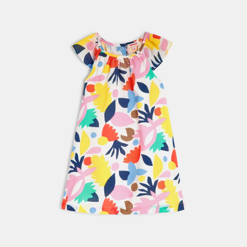 Une large palette de feuilles et fleurs multicolores s’invitent sur cette robe à l’esprit estival ! Parfait pour un après-midi au parc ou s’amuser en famille.