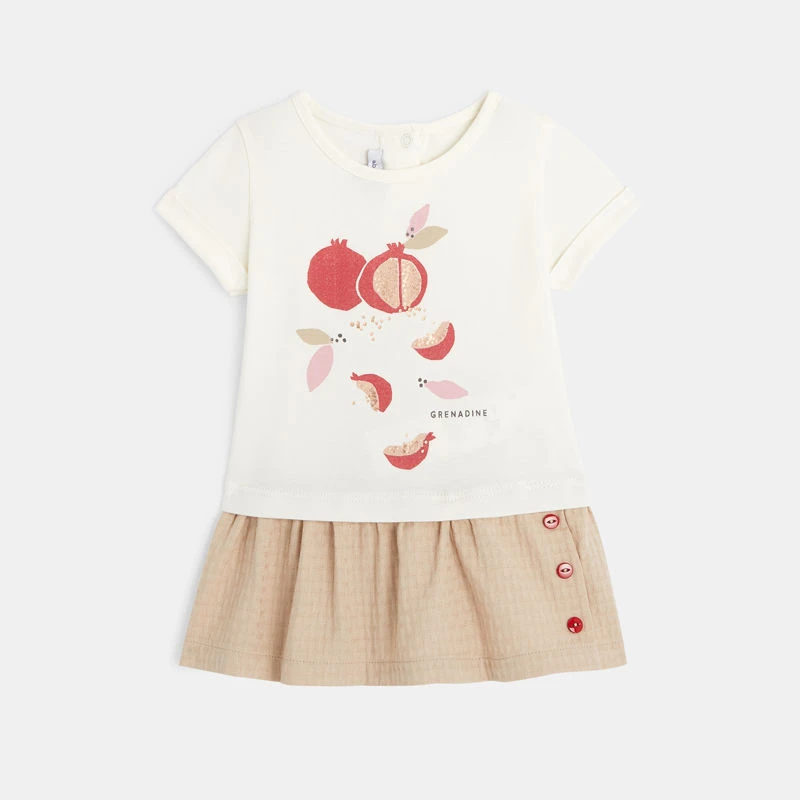 Cette robe mixe les styles à la perfection, c’est l’indispensable à avoir dans son dressing pour l’été. Confectionnée en jersey pour le côté léger elle est ornée de motifs bucolique. Elle affiche une coupe patineuse soulignée par trois petits boutons rouge au niveau de la jupe. A croquer !