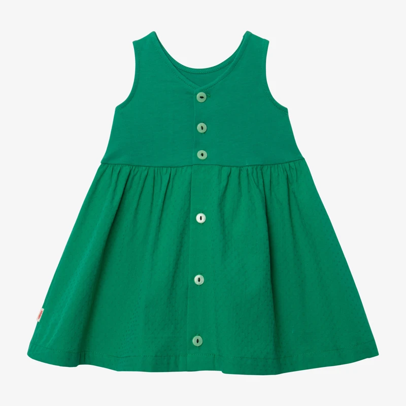 Robe verte pour bébé fille. Coupe évasée, avec col rond et sans manches. Haut en jersey. Bas en voile micro armuré de coton, à jacquard fantaisie. 2 poches plaquées devant, forme tulipes, avec broderies. Découpe taille. Fermeture par boutons. Signature Catimini côté.