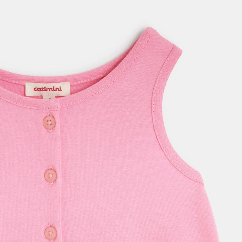Robe pour bébé fille bicolore rose malabar et à motifs abstraits multicolores. Haut à la coupe droite, col rond et sans manches, jupe évasée. En jersey de coton et doublure en voile de coton. Taille élastiquée cintrée. Ouverture par boutons sur le devant. Signature Catimini sous la poche droite.