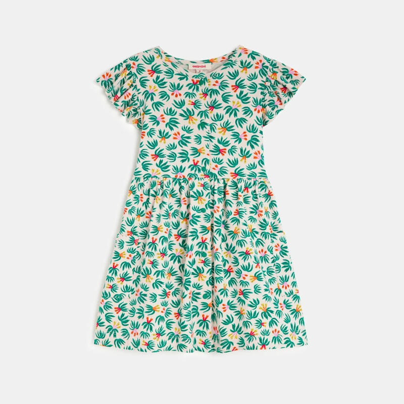 Robe rose pâle pour bébé fille à imprimé plantes tropicales. Coupe évasée, col rond et manches courtes. Jersey de coton et élasthanne. Ouverture devant par boutons-pression. 2 poches à l’avant. Signature Catimini sur le côté.