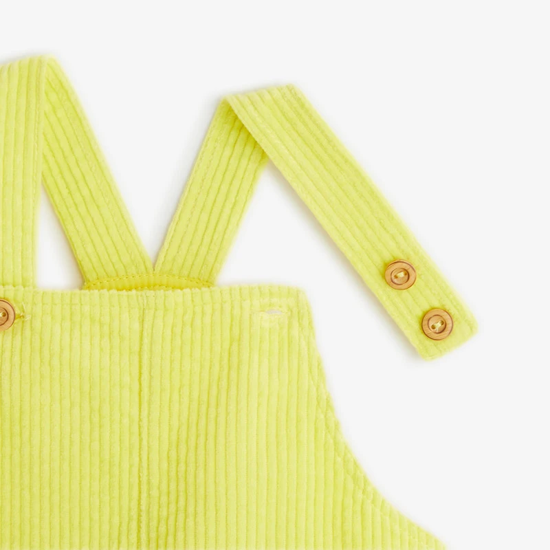 Robe bébé fille. Couleur jaune. En velours puebla. 2 poches sur le côté. Détails boutons au niveau des bretelles et sur le côté. Arc-en-ciel sur une poche avant. Signature étiquette Catimini sur le côté.