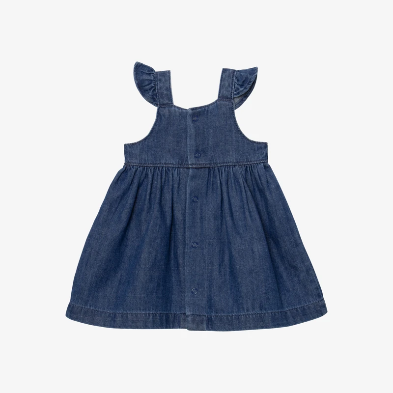 Robe bleu stone pour bébé fille. Coupe évasée, à col rond et bretelles à volant. Denim de coton, avec broderies devant. Découpe poitrine. Détail de boutons décoratifs devant. Fermeture par pressions dos. Signature Catimini côté.