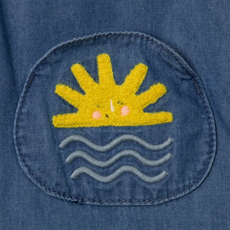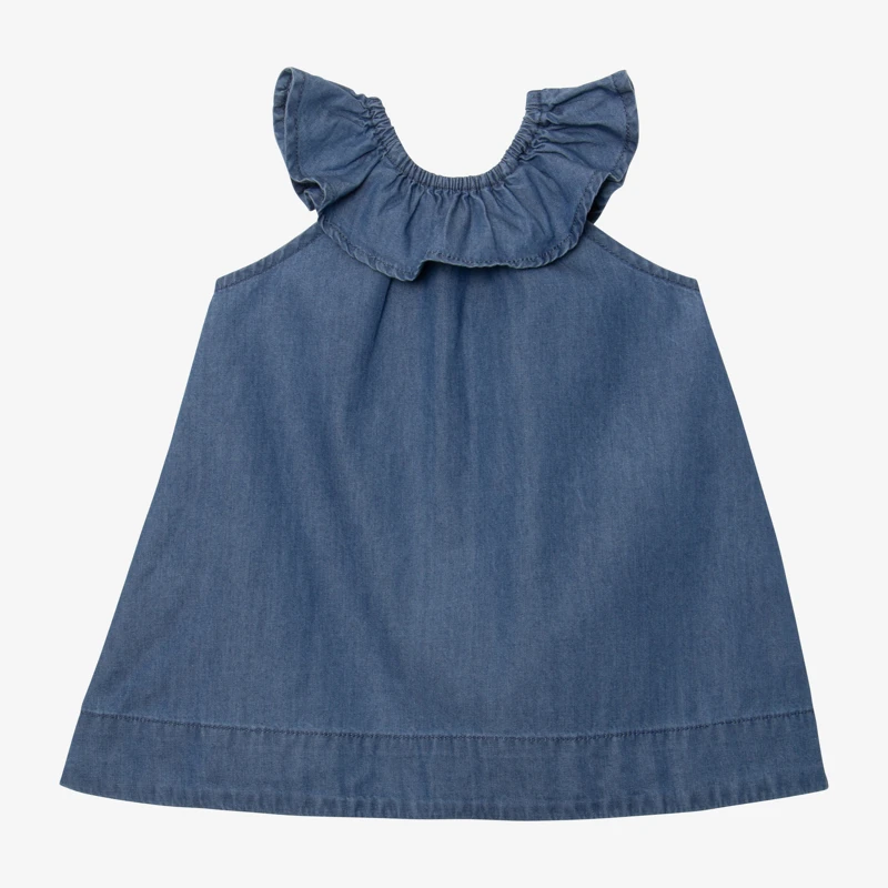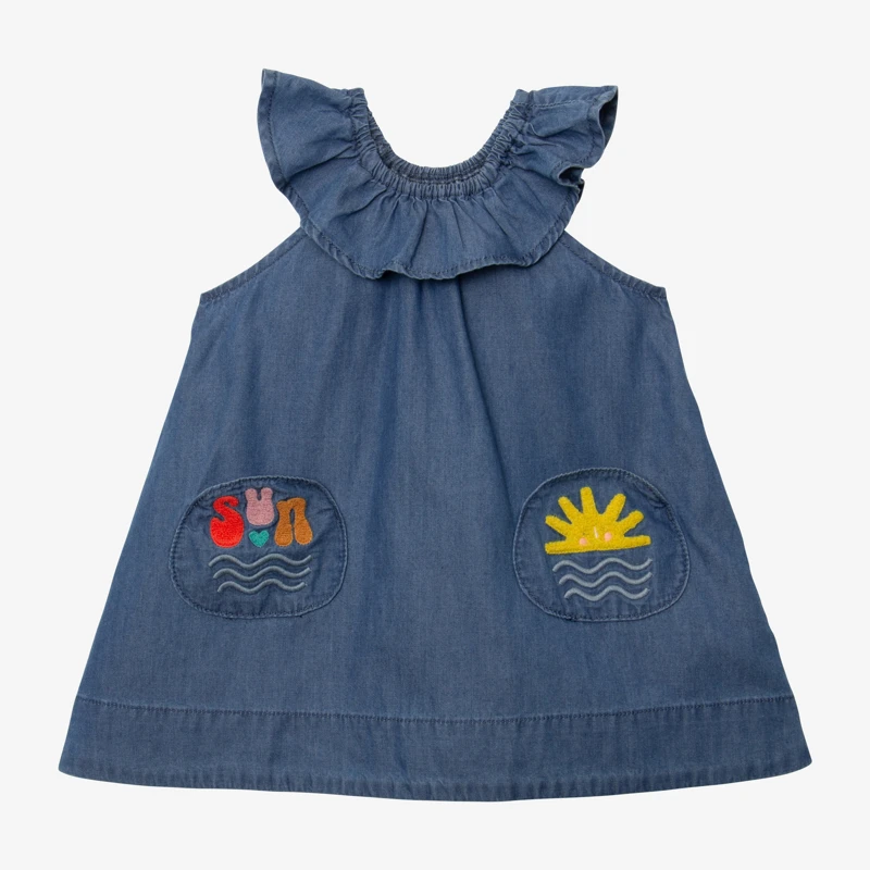 Pourquoi on adore cette robe pour bébé fille ? Pour son encolure élastiquée qui facilite l’habillage. Pour ses poches rondes animées de broderies. Pour son denim léger, plus estival.