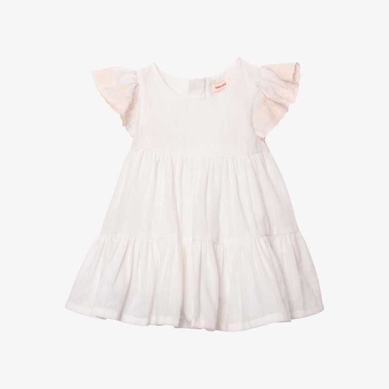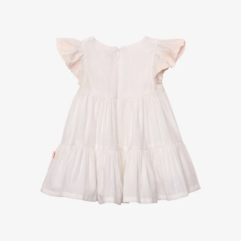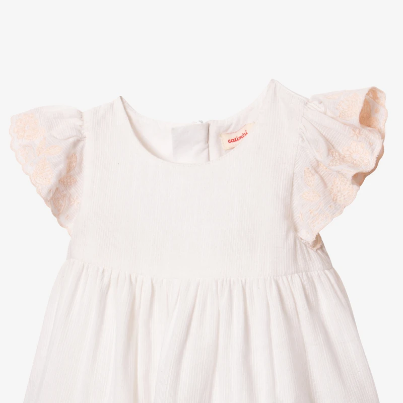 Pour ses premièrs grands évênements elle veut être la plus élégante. Robe écru pour bébé fille. Forme évasée avec col rond et manches courtes. Voile texturé de coton. Doublure voile de coton. Manches brodées rose thé. Fermeture par zip au dos. Signature Catimini sur le côté.