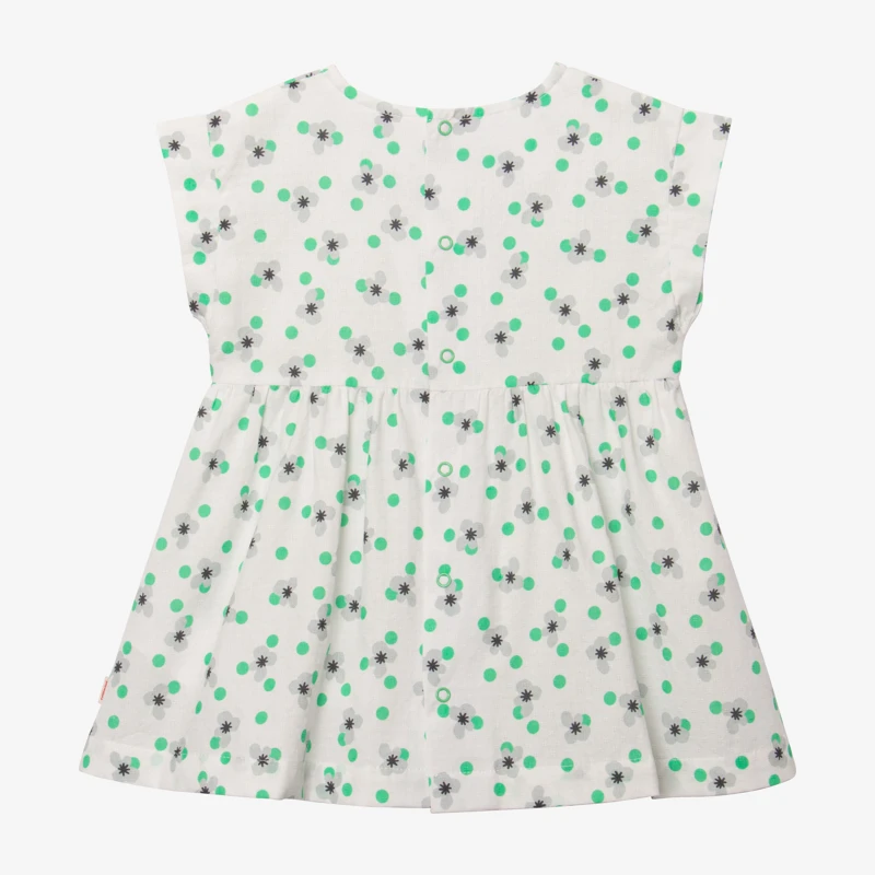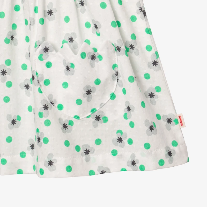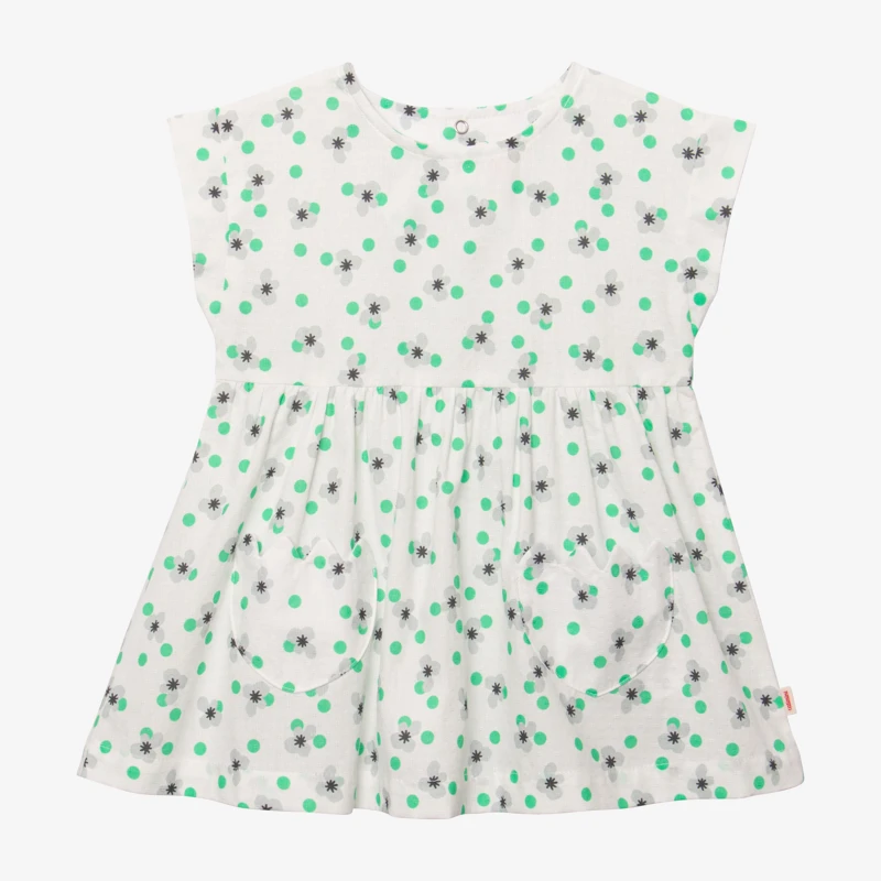Robe écrue pour bébé fille. Coupe évasée, à col rond et petites manches courtes. Voile de coton, à imprimé micro fleurs pop sur jacquard fantaisie. Découpe taille. 2 poches plaquées devant, forme tulipes. Fermeture par pressions dos. Signature Catimini côté.