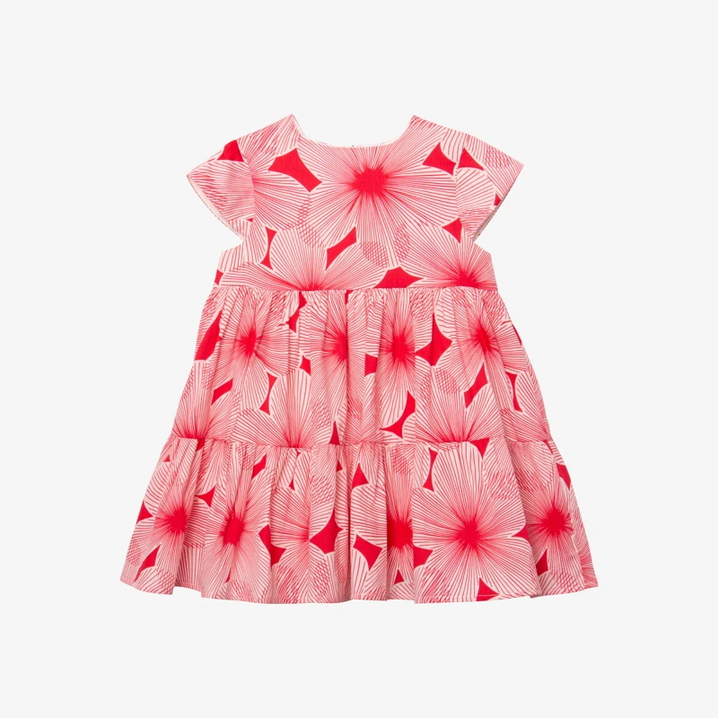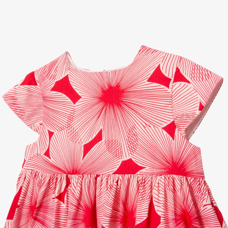 Robe rose pivoine pour bébé fille. Coupe évasée, avec col rond et petites manches courtes. Satin de coton à imprimé pivoines. Doublure en voile de coton. Détail de découpes pour volume. Fermeture par zip invisible. Signature Catimini sur le côté.