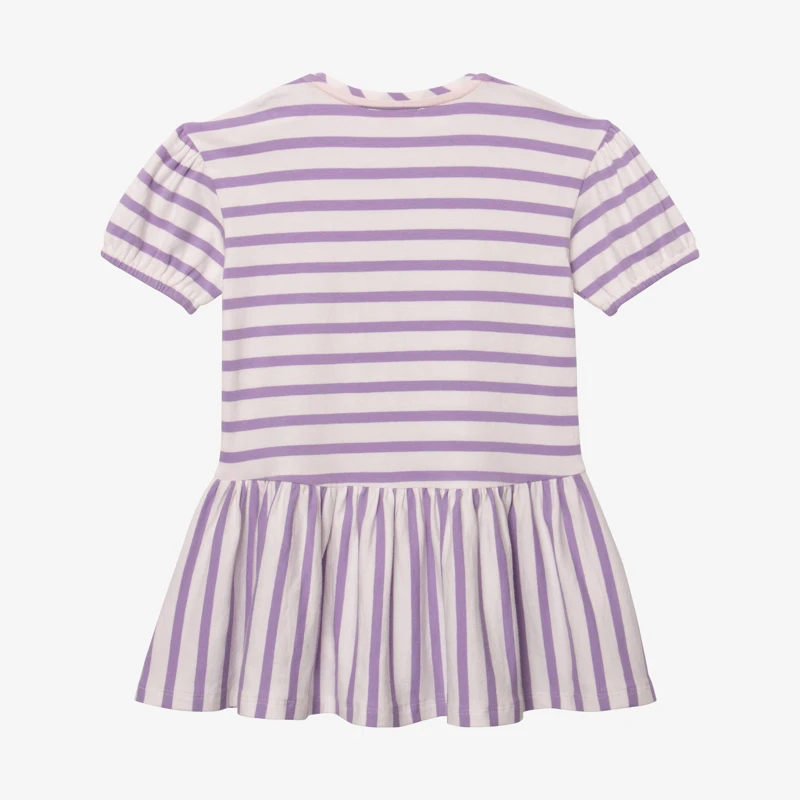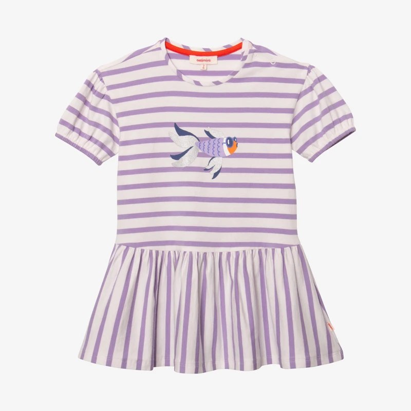 Robe écrue pour bébé fille. Coupe droite, à col rond pressionné et manches courtes forme ballon. Jersey de coton et élasthanne, à rayures violet parme et visuel poisson. Découpe pour volume. Bords élastiqués aux manches. Signature Catimini côté.