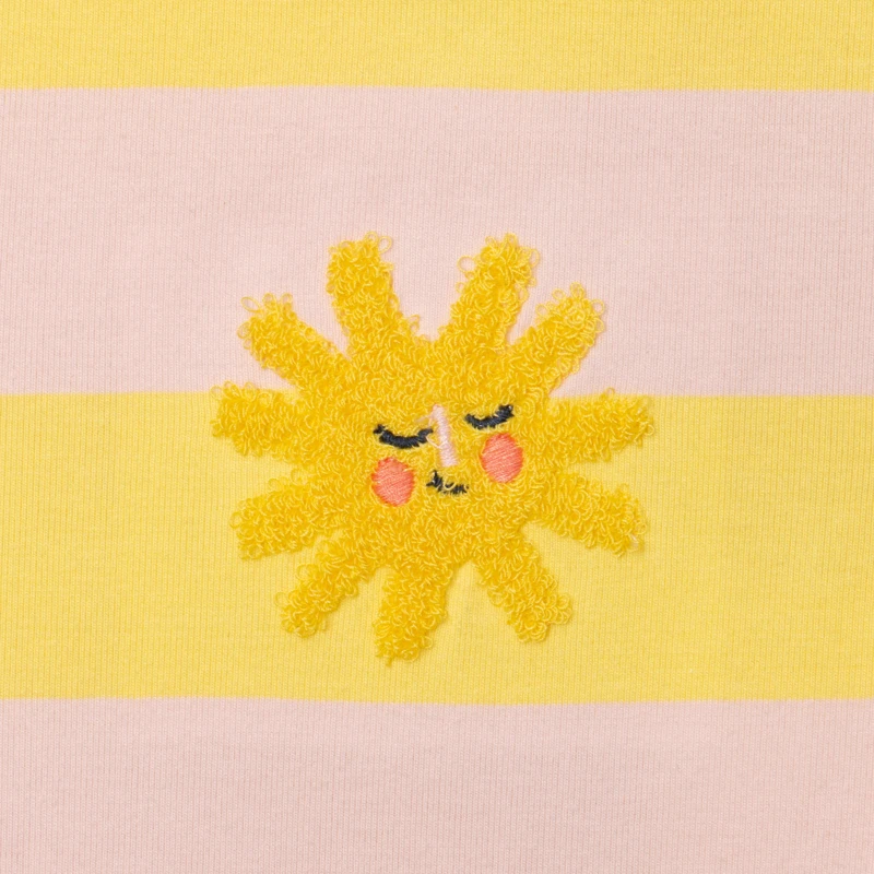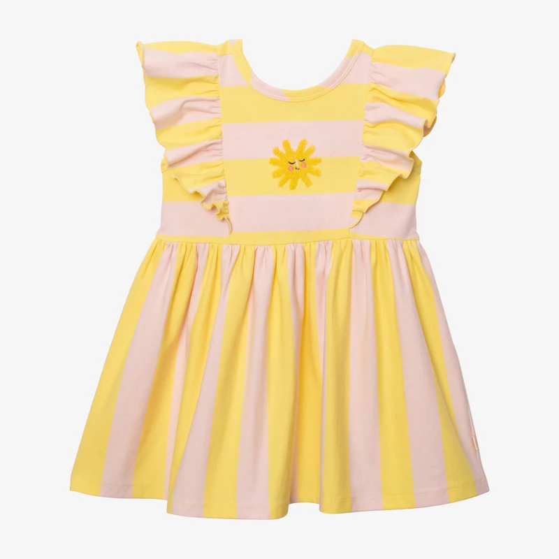 Douce et légère, la robe d’été se porte comme un tee-shirt. Les volants romantiques répondent aux rayures graphiques, unies par un soleil malicieux, en bouclette brodé.