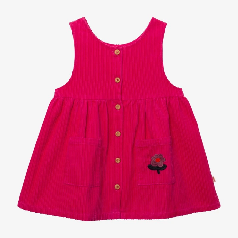 Robe rose shocking pour bébé fille. Coupe évasée, à col rond et sans manches. Velours puebla de coton. Découpe taille. 2 poches plaquées devant, avec broderie. Fermeture par boutons. Signature Catimini sur côté.