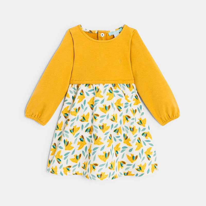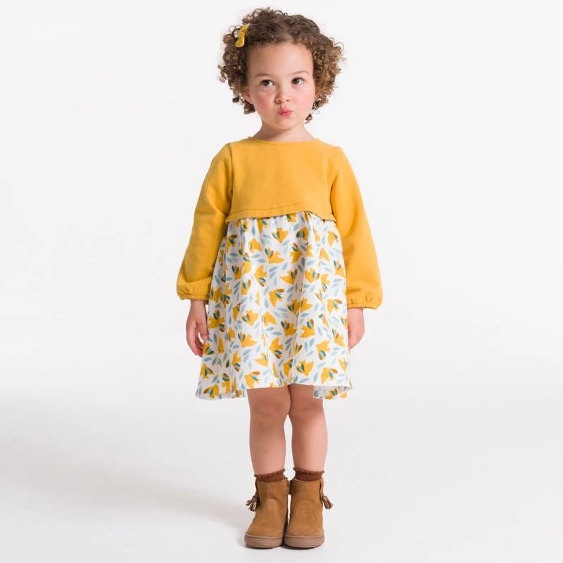 Une forme ample et tout confort pour des journées actives et une liberté de mouvements pour les petites ! Cette robe bi-matière va vite devenir la préférée du dressing grâce à sa belle amplitude et son imprimé original. Haut en velours doux gratté et bas en coton. Manches longues élastiquées et habillage facile grâce aux pressions dans le dos.