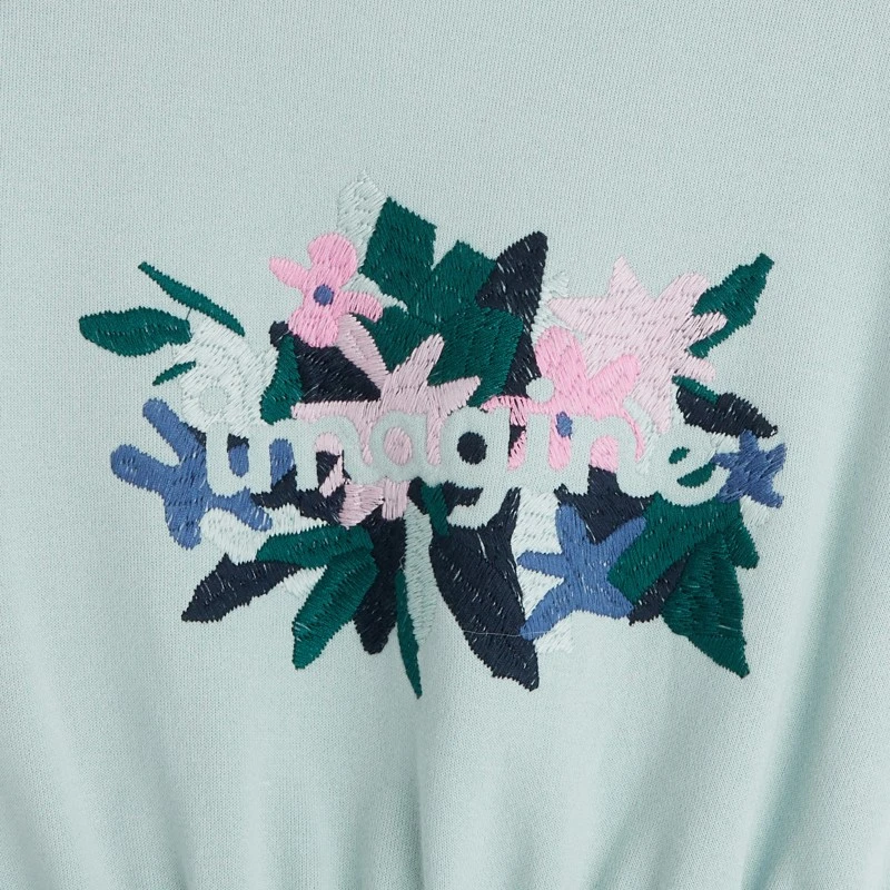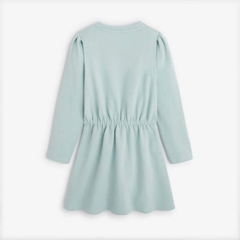 Robe de couleur bleue pour fille . Coupe évasée à col rond. Taille élastiquée. Texte Imagine sur un fond fleuri. Composée à 100% de coton.