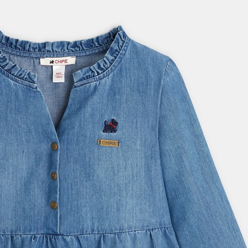 En jean souple et léger, cette robe fera tourbillonner les Chipies dans la cour de récréation. Coup de coeur pour le petit scottish brodé.