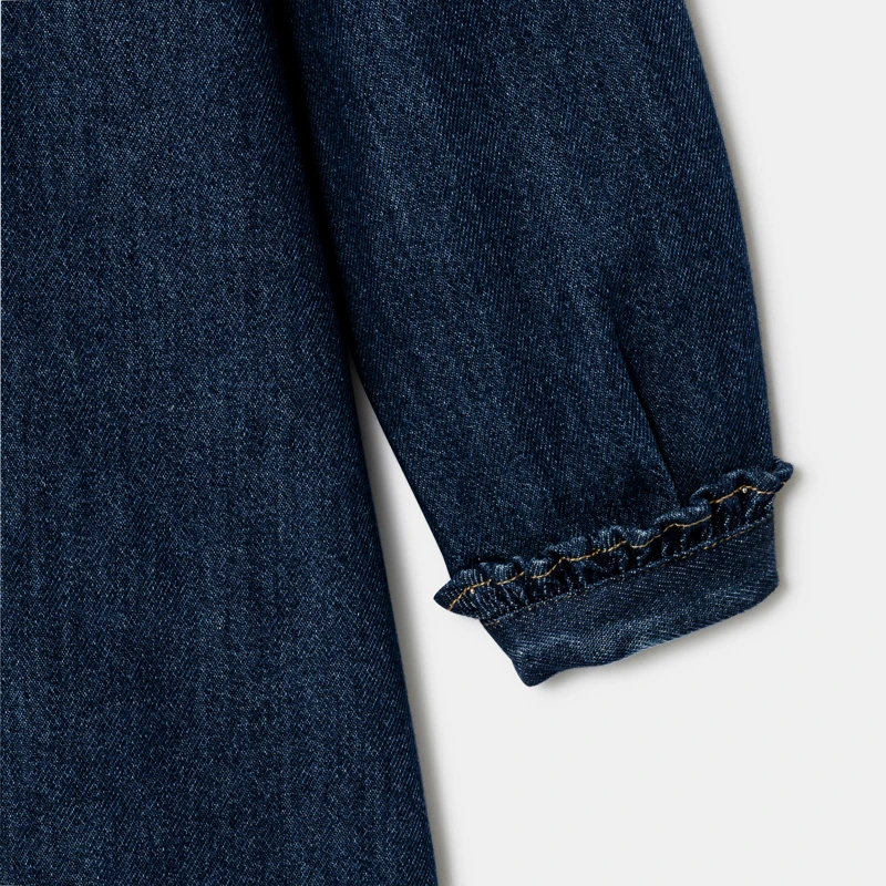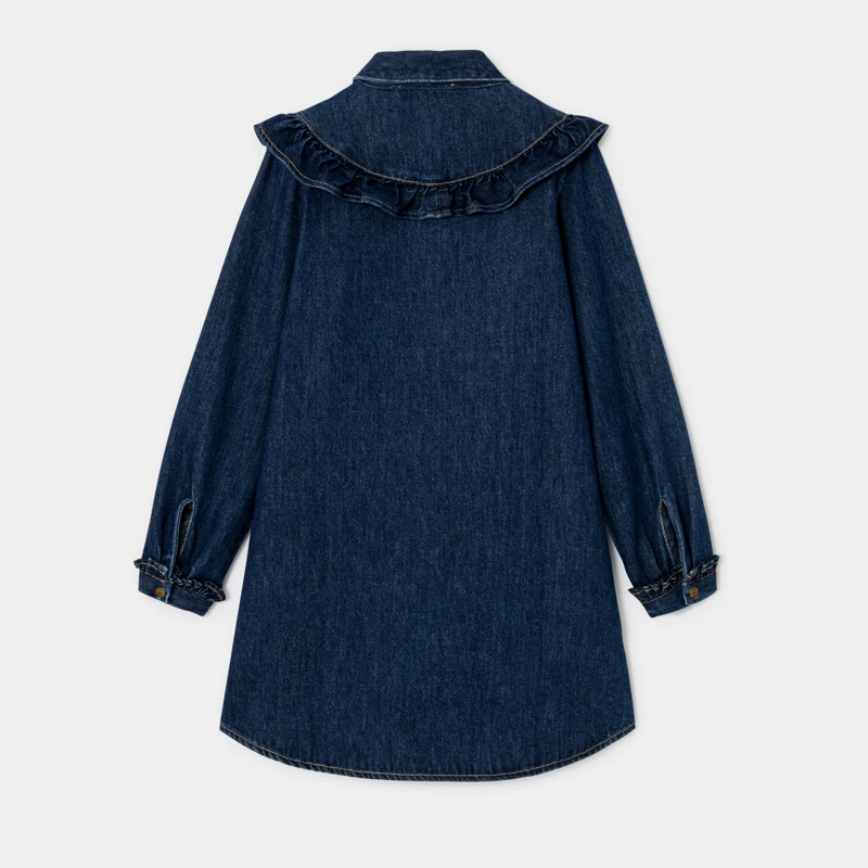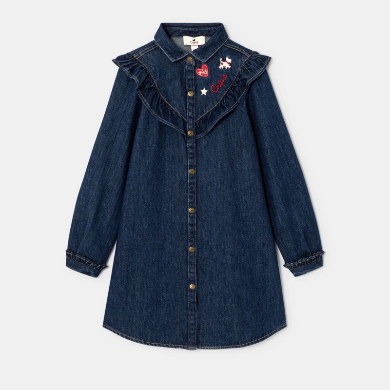 La robe à la fois élégante et décontractée que veulent toutes les Chipies. Une coupe chemise, un coton denim incontournable, un col volanté et des broderies iconiques : elle ne marque que des bons points dans la cour de récré ! Entièrement boutonnée devant, broderies au niveau de la poitrine.