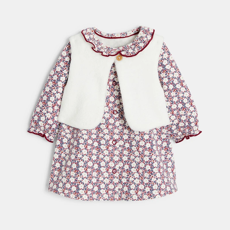 Un champ de fleurs pour les romantiques avec cette robe d’une belle ampleur ! En molleton doux et souple qui réchauffe les petites, avec en plus un gilet en soft boa sans manches qui crée l’ensemble. On aime les manches longues élastiquées et les pressions devant pour un habillage facile.