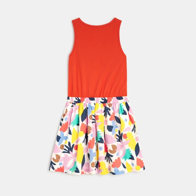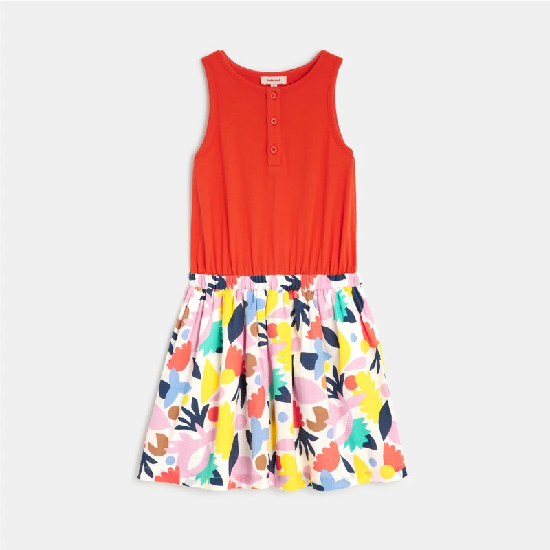 Robe pour fille bicolore rouge grenade et à motifs abstraits multicolores. Haut à la coupe droite, col rond et sans manche, jupe évasée. Taille cintrée et élastiquée. En jersey de coton. Signature Catimini sur le côté.