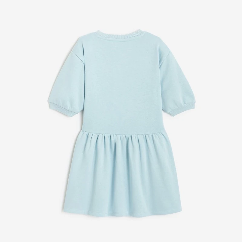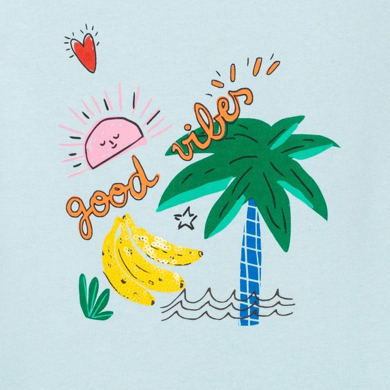 Robe unie fille bleu azur avec motifs tropicaux. Coupe droite, col rond et manches courtes. Coton et polyester. Découpe à la taille et fronces légères au jupon. Manches ballon avec bords élastiqués. Signature Catimini sur le côté.