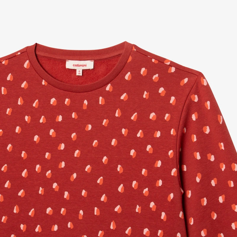 Robe sweat rouge brique pour fille, ligne Les Essentiels. Coupe droite, à col rond et manches longues. Molleton de coton et polyester mélangés, à imprimé bicolore. Bords-côtes au col et manches. Signature Catimini côté.