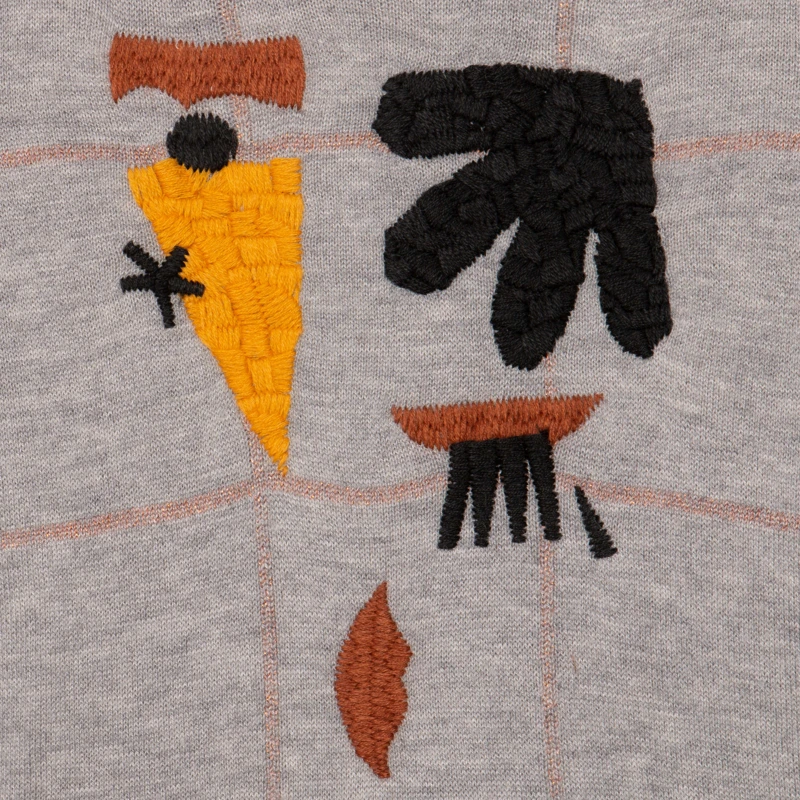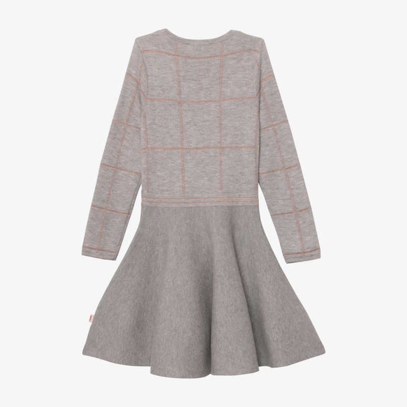 Robe gris chiné pour fille. Coupe patineuse, avec col rond et manches longues. Maille tricot polyamide, coton et laine mélangés. Jacquard à maxi motifs brodés esprit papier découpé sur fond carreaux lurex. Bord-côte au col. Signature Catimini sur côté.