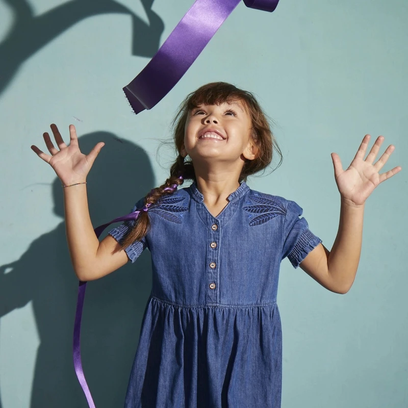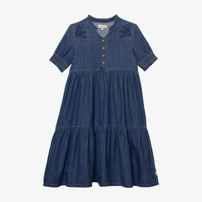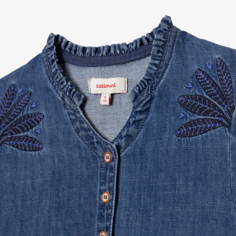 Robe bleu stone pour fille. Coupe évasée, à col V avec petite rehausse et manches courtes élastiquées. Denim light de coton et élasthanne. Détail de broderies feuilles devant. Fermeture par boutons. Signature Catimini côté.