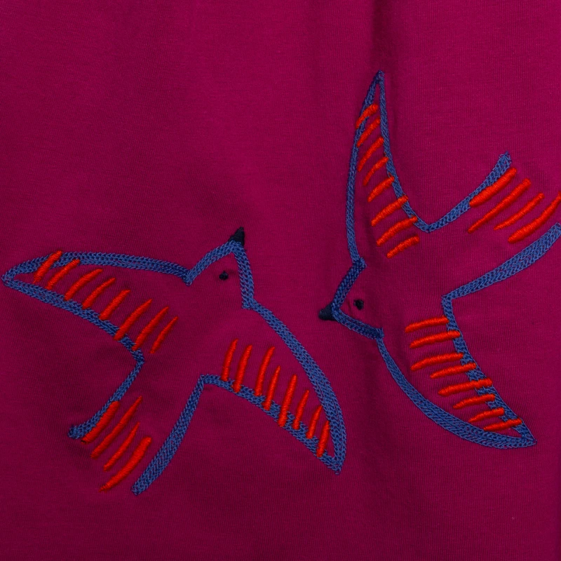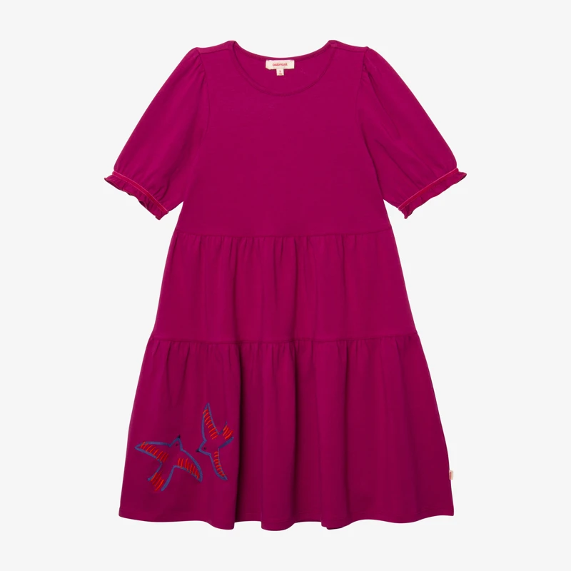 Robe rose pétunia pour fille. Coupe évasée, à col rond et manches courtes. Jersey de coton et élasthanne, avec broderie bas de robe devant. Détail de galon élastiqué et fronces aux manches pour forme ballon. Découpes pour volume. Détail de broderie bas de robe devant.