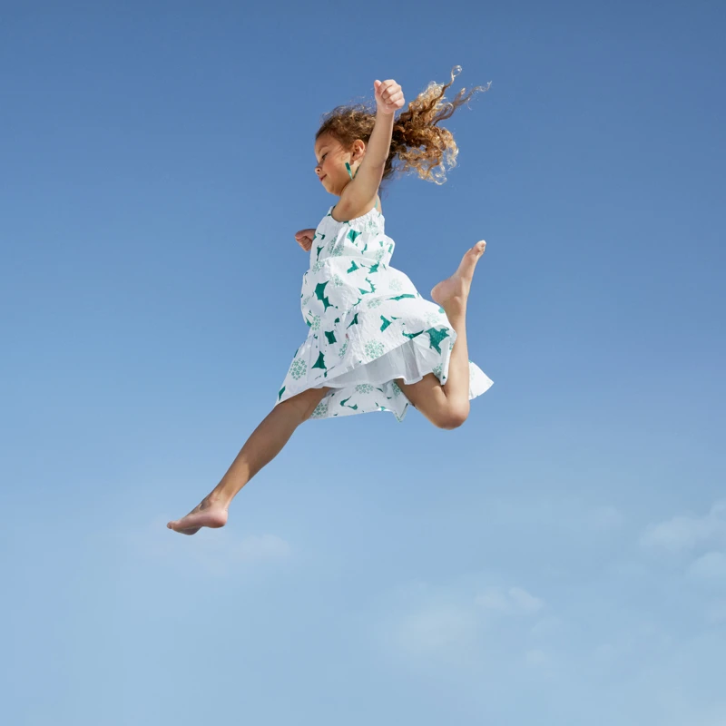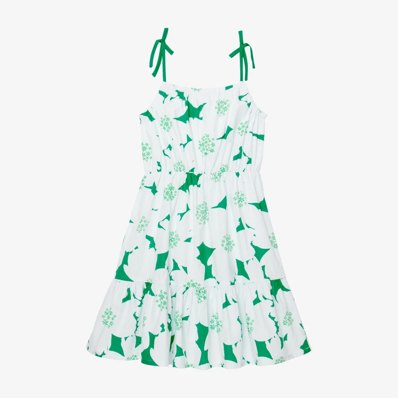 Robe verte pour fille. Coupe droite, à col rond et bretelles avec noeuds. Coton dobby à imprimé maxi fleurs. Doublure en voile de coton. Découpe taille élastiquée. Découpe bas de robe pour volume. Signature Catimini côté.