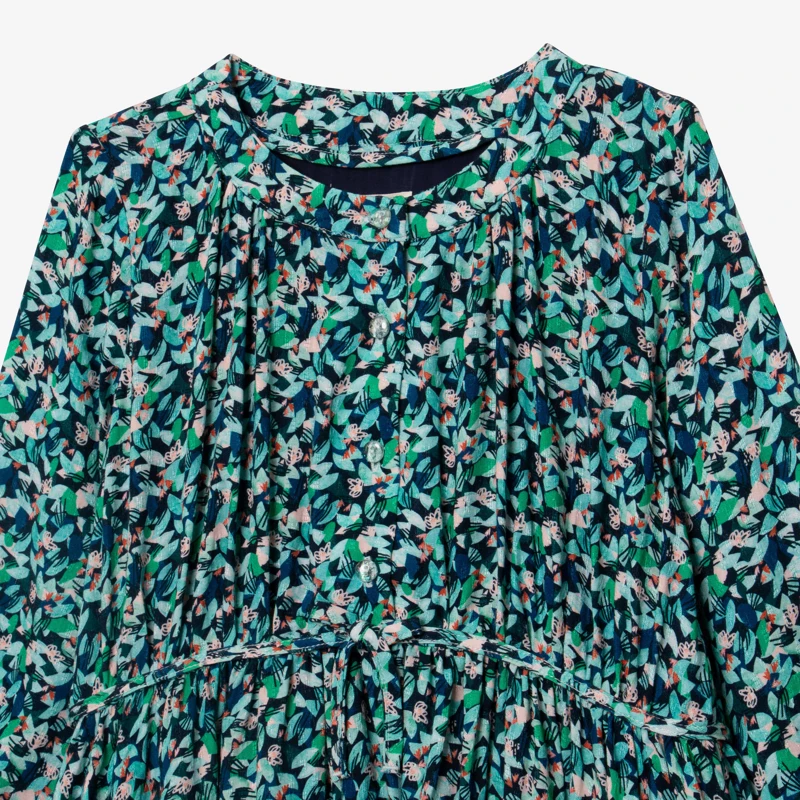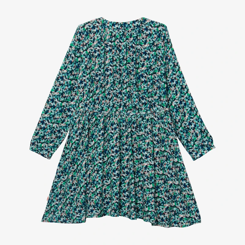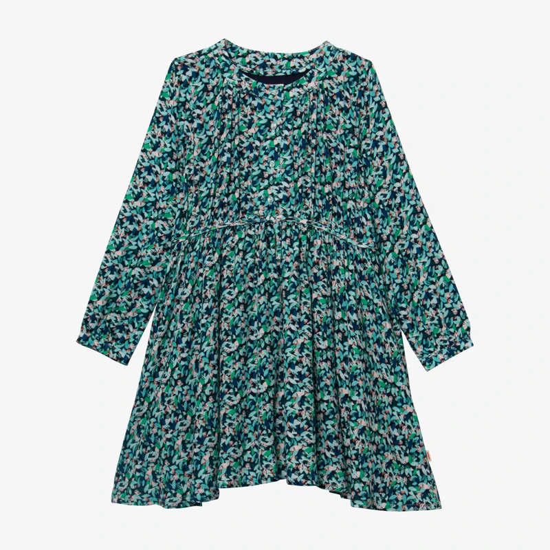 Robe vert émeraude pour fille. Coupe évasée, avec col rond et manches longues. Viscose à imprimé micro-fleurs esprit tampon. Doublure en viscose. Découpe taille avec nœud fixe. Fermeture par boutons. Signature Catimini sur côté.