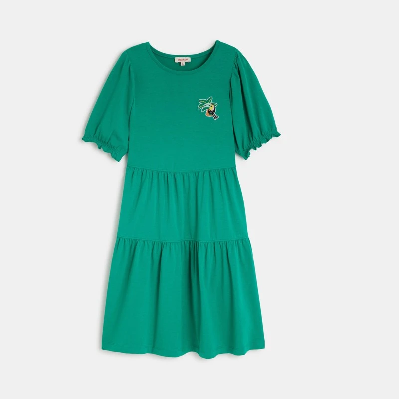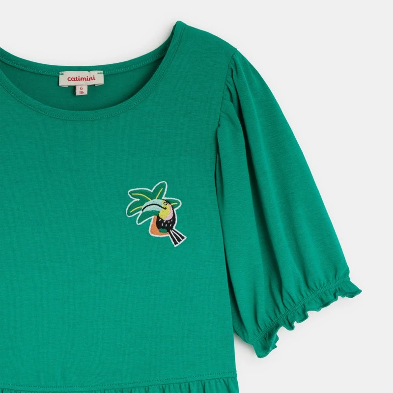 Robe pour fille vert lichen à motif toucan. Coupe évasée, col rond et manches courtes. En jersey de coton recyclé et élasthanne. Manches ballons élastiquées avec détails volantés. Jeu de découpes pour volume. Signature Catimini sur le côté.