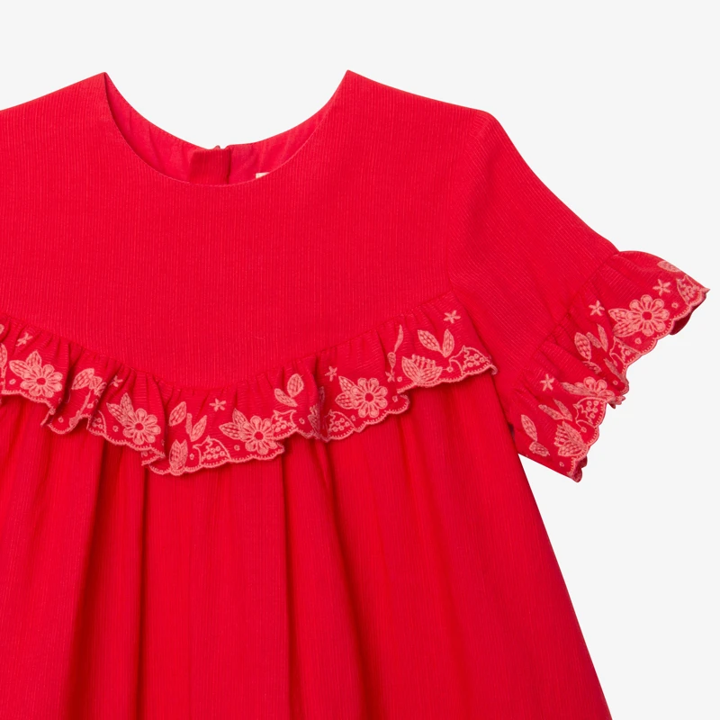 Robe rose pivoine pour fille. Coupe évasée, à col rond et manches courtes. Voile texturé de coton. Doublure voile de coton. Broderies sur volants devant et manches. Découpe pour volume bas de robe. Fermeture par zip invisible au dos. Signature Catimini côté.