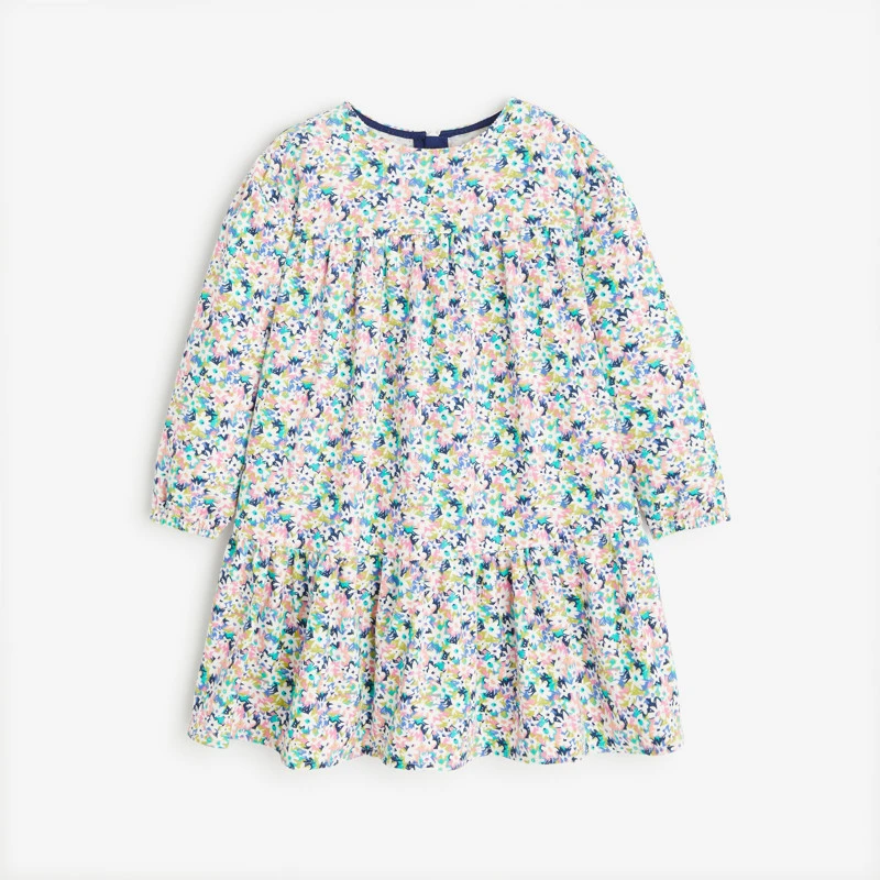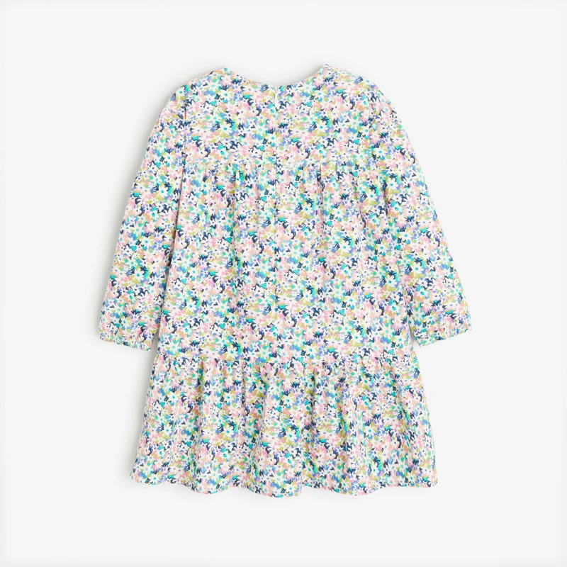 Robe fleurie bébé fille. Couleur violette. Coupe évasée. Manches longues. Doublée d’un voile. 100% coton. Velours milleraies.