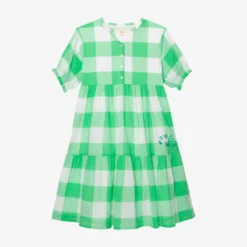 Robe écrue pour fille. Coupe évasée, avec col rond à rehausse plissée et fente en V, manches courtes smockées. Voile de coton et élasthanne texturé, avec imprimé maxi vichy. Doublure en voile de coton. Découpes pour volume. Fermeture par boutons devant. Signature Catimini côté.