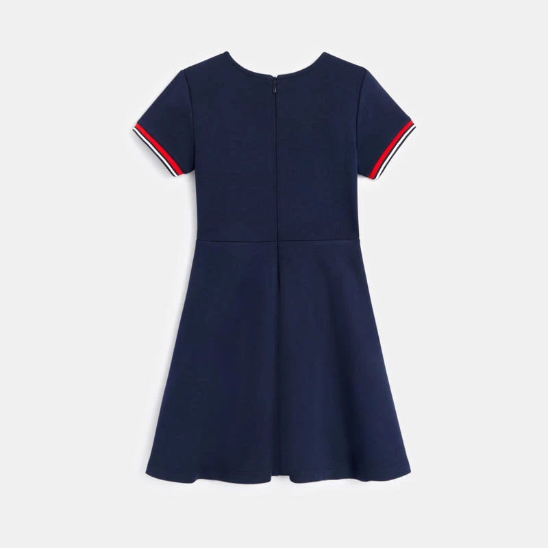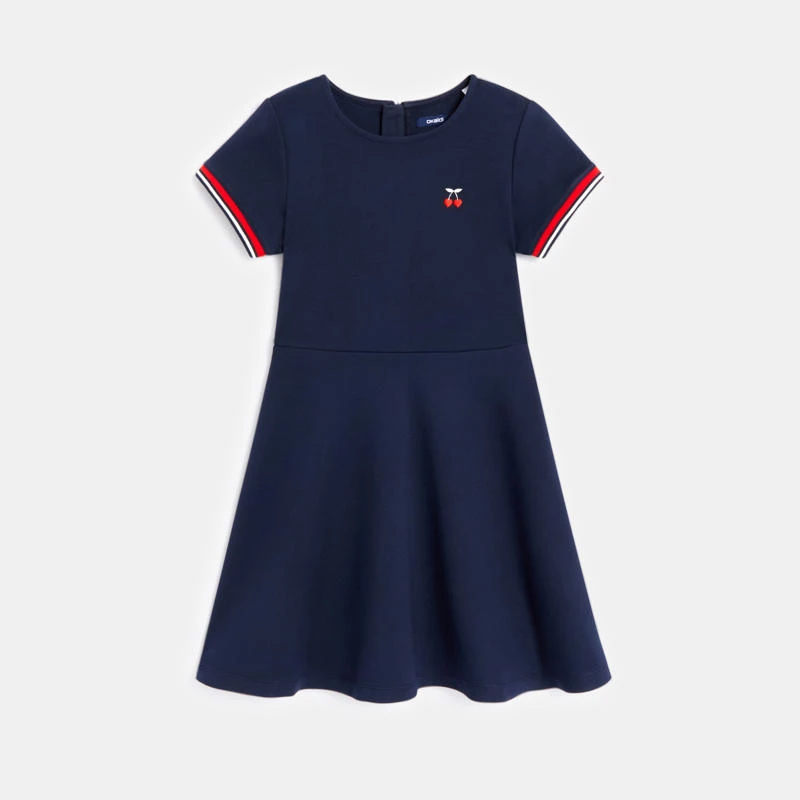 Les détails ont leur importance pour personnaliser cette robe patineuse unie et toute simple. Ici, la broderie « cerise cœur » et les bords côtelés rayés des manches courtes donnent un esprit sportswear. Coupe évasée sous la taille marquée. Encolure arrondie, ouverture zippée dos, enfilage facile.