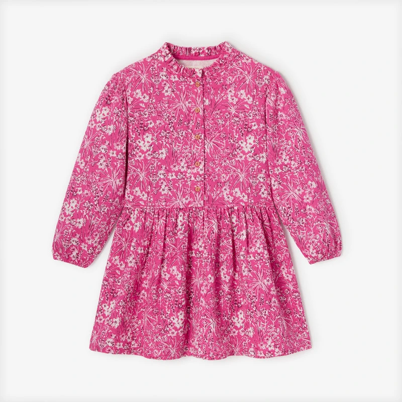 Robe tubique rose à imprimés fleurs pour fille. Coupe evasée à col cheminé et manches longues. 5 bouton sur le devant de la robe facilitant l’enfilage. Matière confortable. Signature Catimini sur le côté de la robe.
