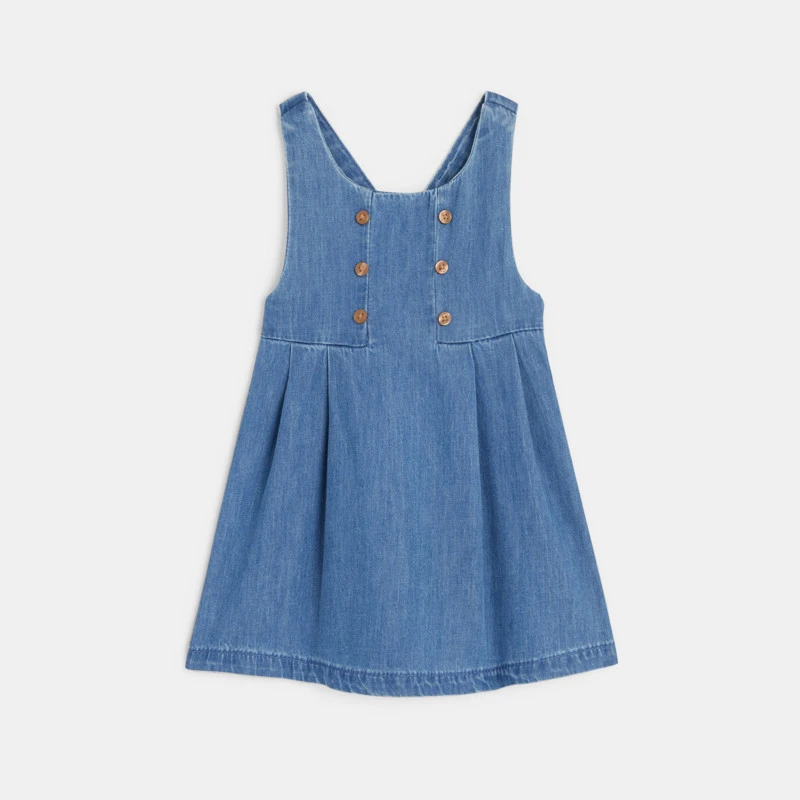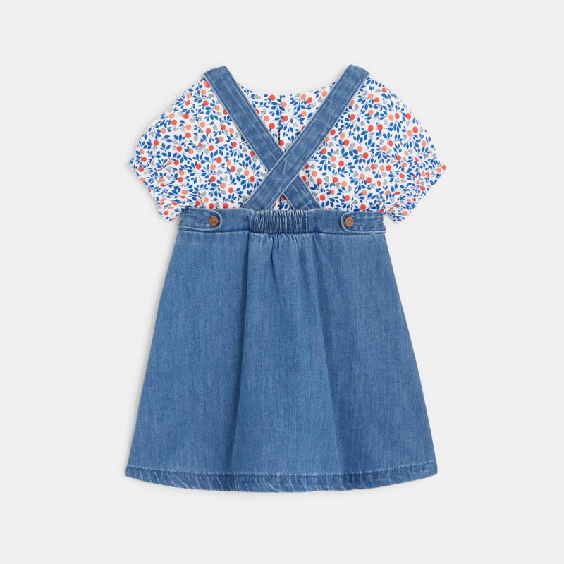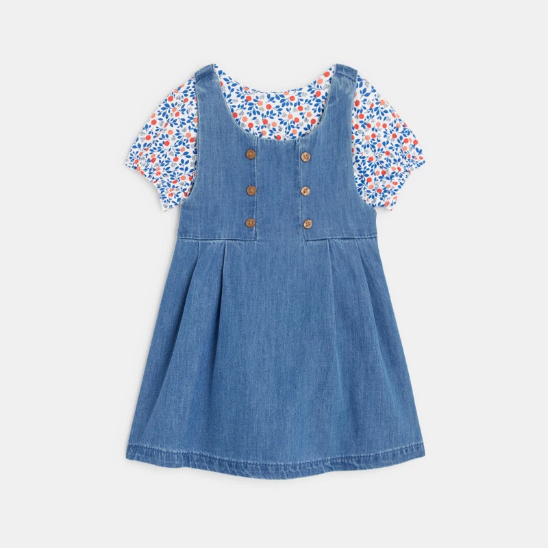 L’incontournable robe salopette du dressing des filles se décline en denim léger pour les beaux jours. Boutons fantaisie et jeu de plis devant. Assortie d’un tee-shirt fleuri manches courtes élastiquées pour une touche vitaminée. Fermeture par pressions dos.