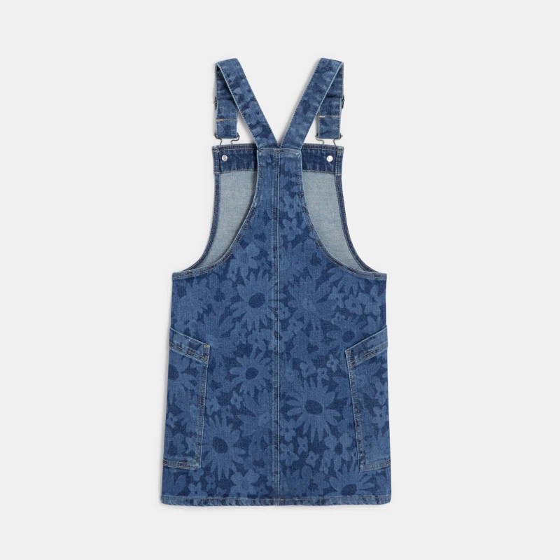 Robe salopette pour fille en jean bleu avec fleurs bleues contrastées. Coupe droite et col droit. Denim de coton, polyester et élasthanne. 2 grandes poches biseautées plaquées sur les cÎtés. Badge Catimini sur poche.