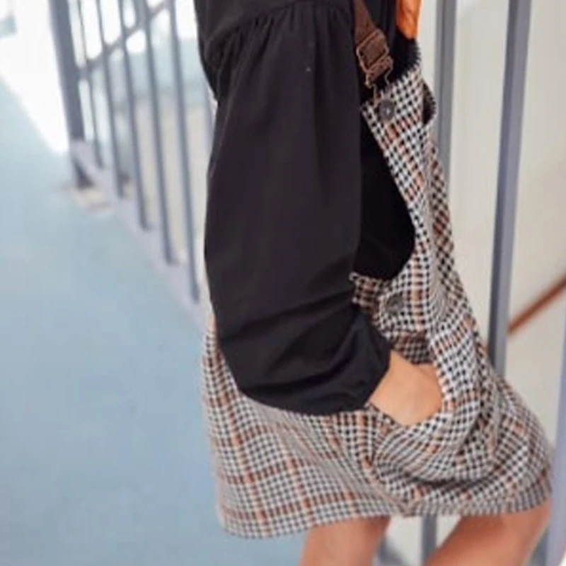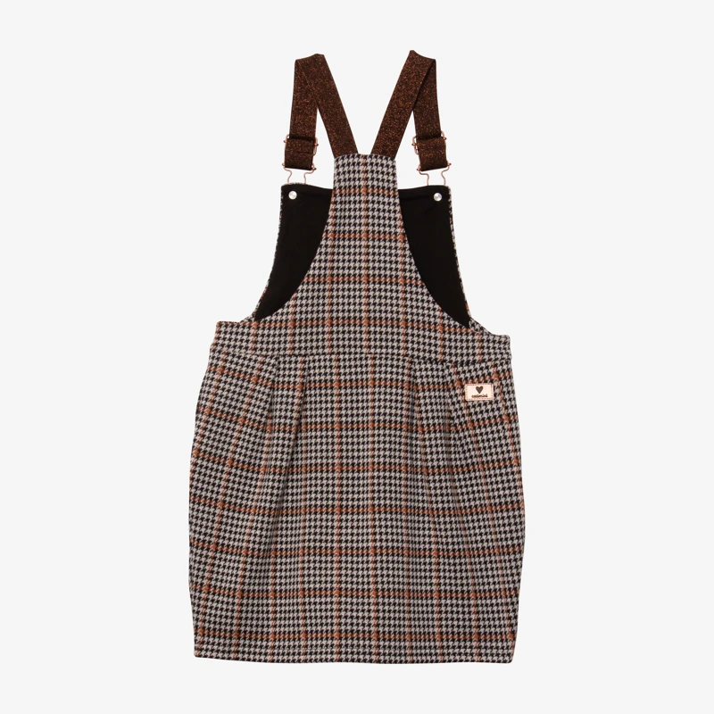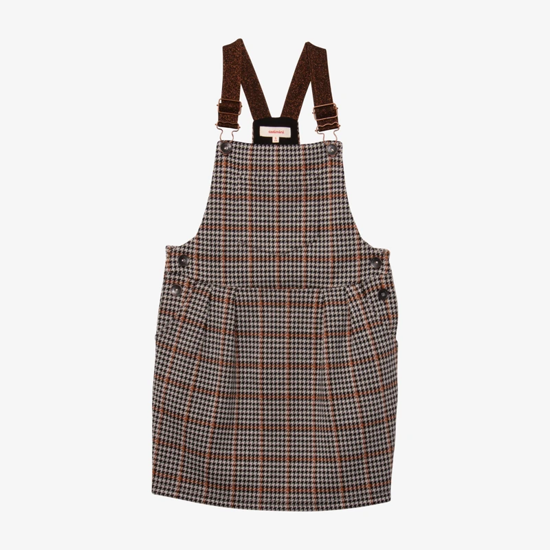 Noir, écru, caramel : le prince-de-galles se réinvente sans compromettre son élégance. Bretelles cuivrées sur forme salopette, il appelle un haut ou des collants unis.