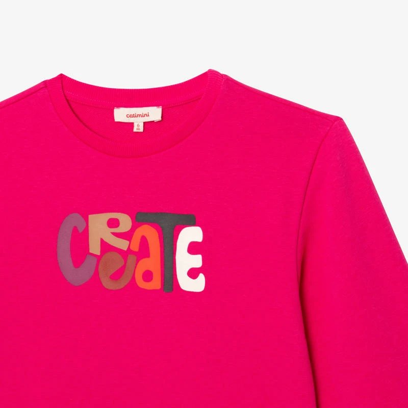 Robe sweat rose shocking pour fille, ligne Les Essentiels. Coupe droite, à col rond et manches longues. Molleton de coton et polyester mélangés, avec visuel message. Découpe taille avec petites fronces. Bords-côtes au col et manches. Signature Catimini côté.