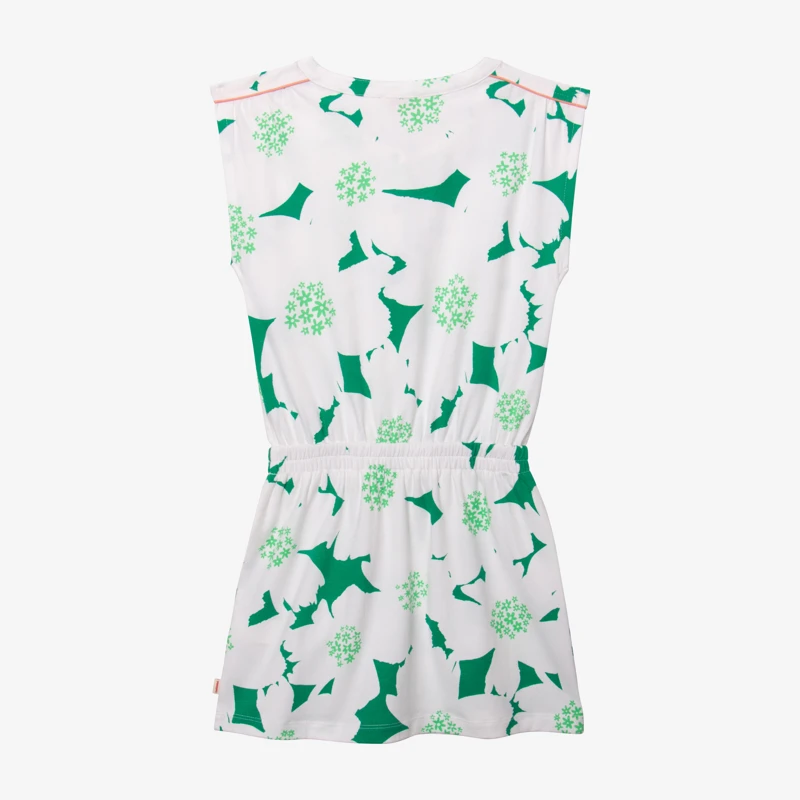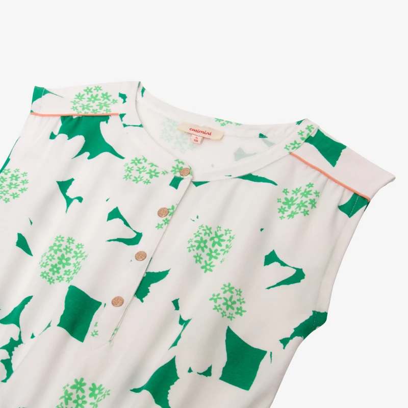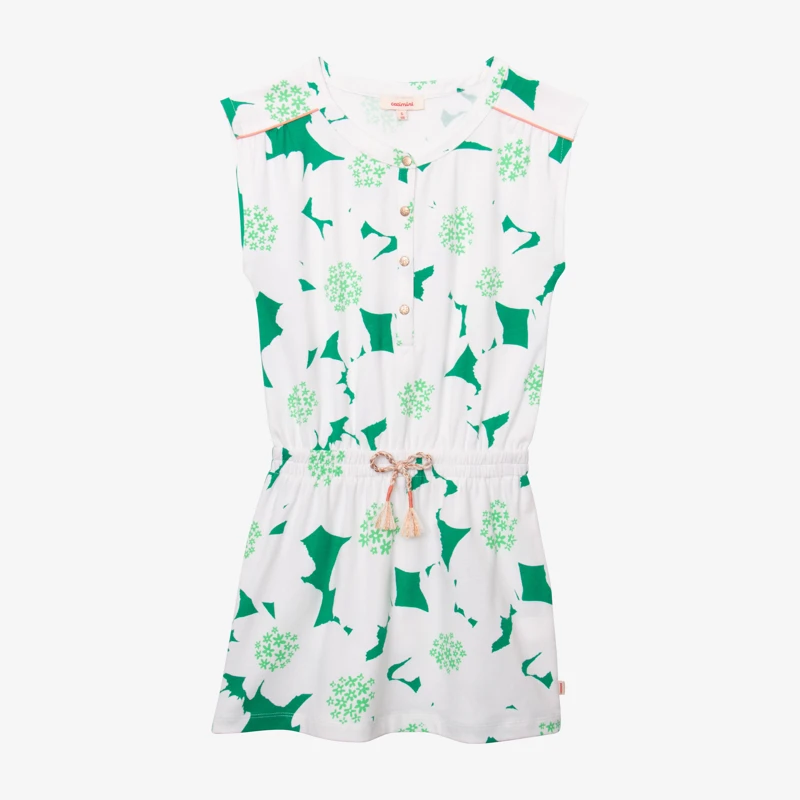 Robe verte pour fille. Coupe droite, à col rond et manches courtes. Jersey de coton et élasthanne, à imprimé maxi fleurs. Découpe taille élastiquée, avec cordon noué. Fermeture par pressions. Signature Catimini côté.