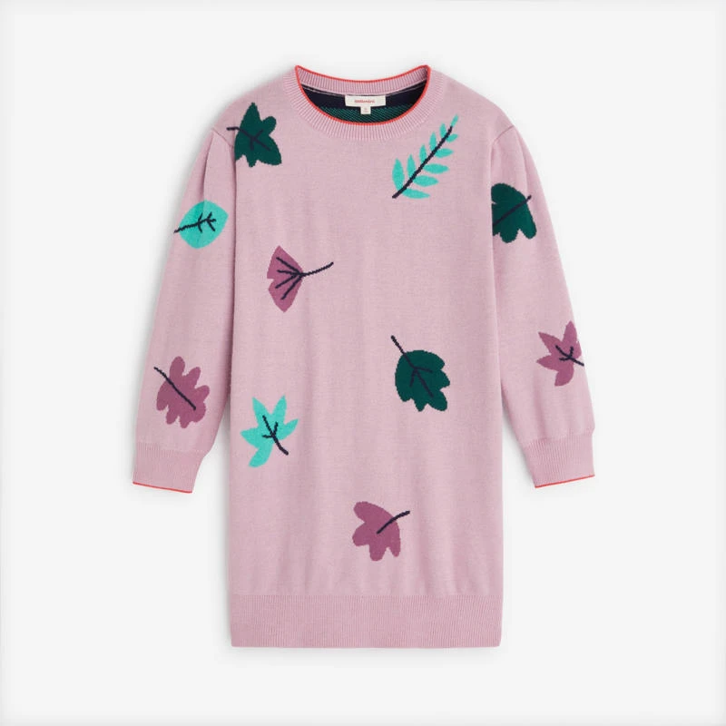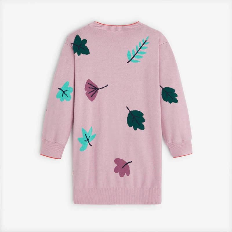 Robe violette pour fille. En tricot. Imprimés de feuilles de différentes couleurs. Coupe droite à col rond. Bords-côtes au niveau des manches, du col et du bas de la robe. Détail orangé sur le col et les manches.
